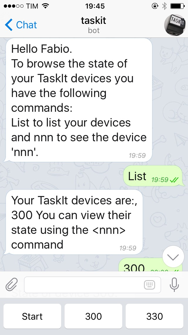 Access data monitored by TaskIT devices through Bots (a kind of inteligent responders) running on the Telegram  Platform.